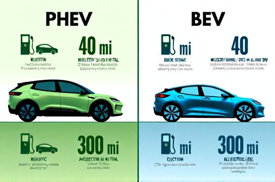 First, the big picture: A **plug-in hybrid (PHEV)** has both a gas engine *and* a rechargeable battery (typically 6–15 kWh), giving you ~20–55 miles of pure electric range before switching to hybrid mode. A **full electric vehicle (BEV)** runs *only* on battery power — no fuel tank, no tailpipe emissions.